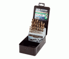 • Estuche de 25 brocas de acero rápido HSSCo 5% calidad M35 con acabado dorado vaporizado.