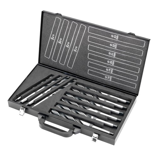 El maletín de brocas DIN 345 HSS Ø14 a 23 es un conjunto de 10 brocas de alta calidad fabricadas en acero de alta velocidad (HSS).