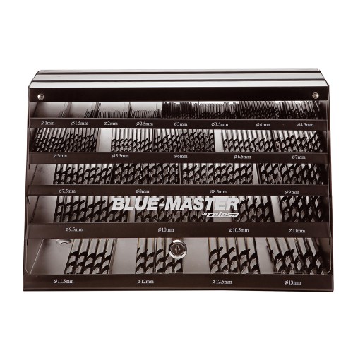 Fabricado con materiales resistentes y duraderos, este expositor cuenta con una amplia gama de brocas de diferentes tamaños, desde 1 mm hasta 13 mm, con un incremento de 0,5 mm.