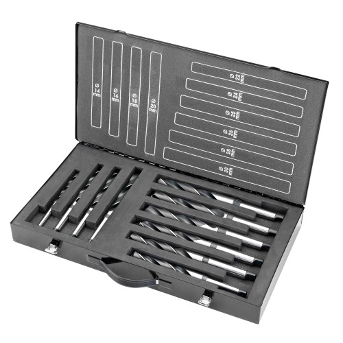 - Presentadas en un práctico maletín para un fácil almacenamiento y transporte, manteniendo las brocas organizadas y protegidas.